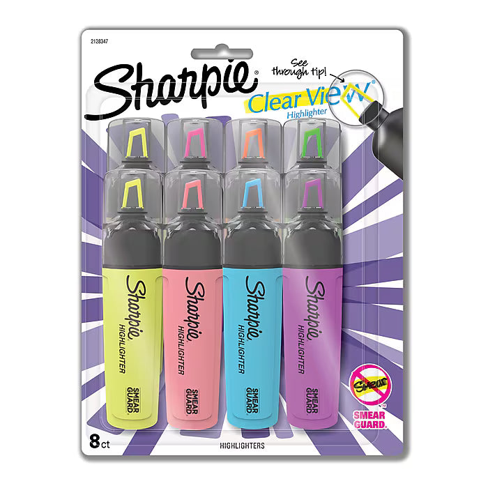 Always know when to stop with the Sharpie Clear View highlighter! A see-through tip allows you to keep your eyes locked on the page and precisely highlight. The blade-style tip lets you switch between both wide and narrow lines. Finally, ultra-vivid ink resists the smearing of many pen and marker inks.